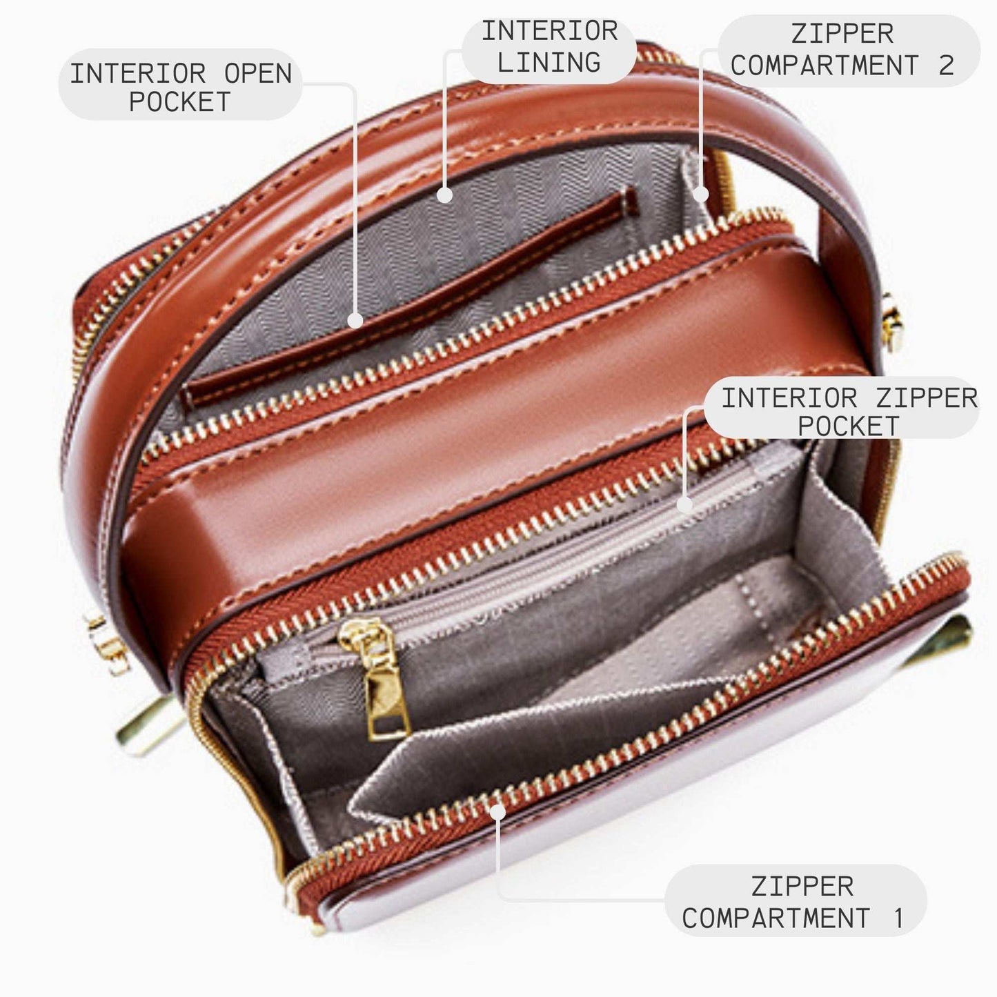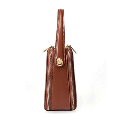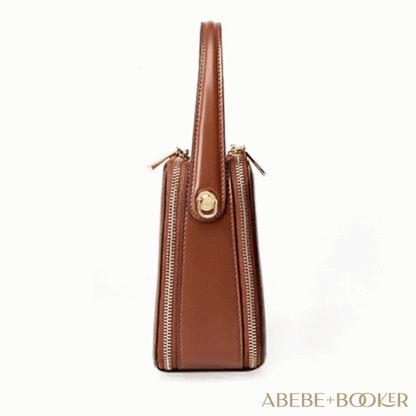 - Exterior: Smooth genuine leather with dual zip compartments